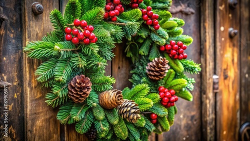 Fototapeta premium Close-up of a vibrant green Christmas wreath, perfect holiday door decoration.
