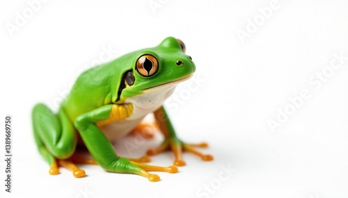 © Sunisa, Naklejka premium Close-up of a vibrant green frog against pure white, studio, wildlife photography, reptiles