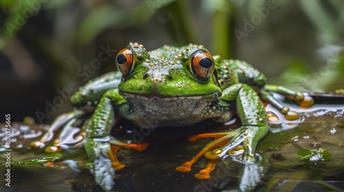 © Dustin, Obraz premium Close-up of a vibrant green frog with bulging eyes perched on a lily pad, embodying intrigue and adaptability of nature