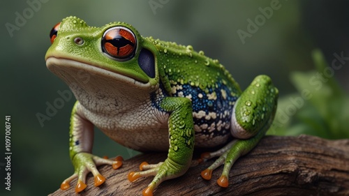 © Syarif, Naklejka premium Close-up of a vibrant green frog with orange eyes perched on a branch.