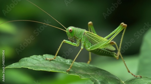 Fototapeta premium Close-up of a vibrant green grasshopper on a leaf.