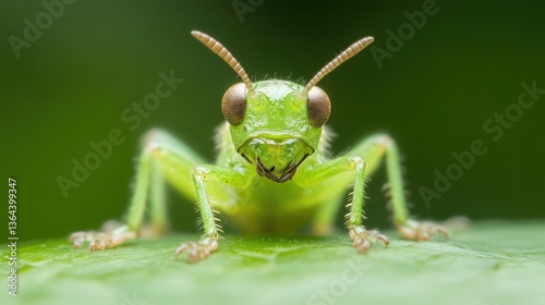 © danadesa, Naklejka premium Close-up of a vibrant green grasshopper on a leaf. Details of its antennae, eyes, and legs are clearly visible