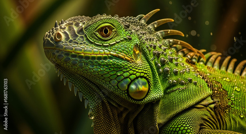 Fototapeta premium Close-up of a vibrant green iguana, showcasing intricate details of its...