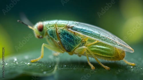 © RAMESH, Naklejka premium Close-up of a Vibrant Green Insect Perched on a Leaf in a Lush Forest During Sunlight