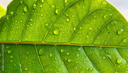 © Dtyra, Fototapeta premium Close-up of a vibrant green leaf covered in water droplets (2)