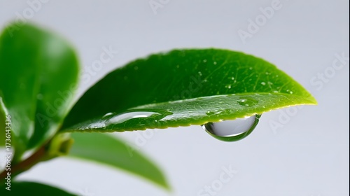 Fototapeta premium Close-up of a vibrant green leaf with a single water droplet resting on its...