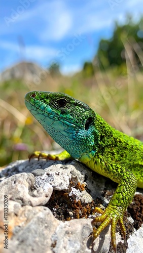 © Mus, Fototapeta premium Close-up of a vibrant green lizard on a rock