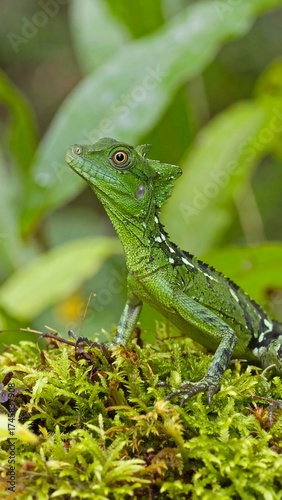 © Lintang, Obraz premium Close-up of a vibrant green lizard on mossy ground