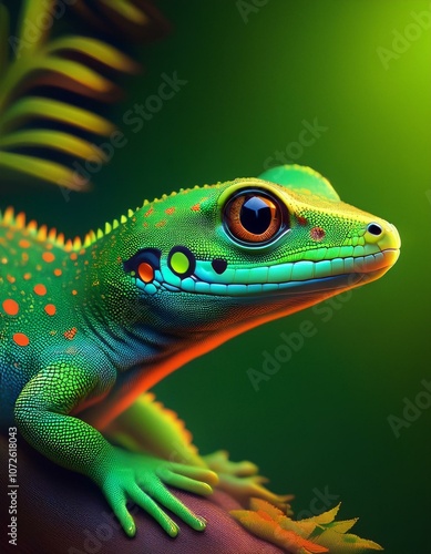 © art, Obraz premium Close-up of a vibrant green lizard with colorful markings, looking to the side with its orange eye.
