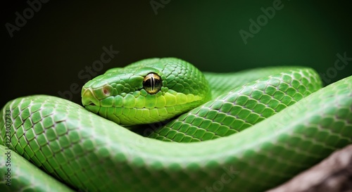 © Alexandr, Obraz premium Close-up of a vibrant green snake resting on a branch