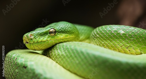 © Alexandr, Fototapeta premium Close-up of a vibrant green snake resting on a branch