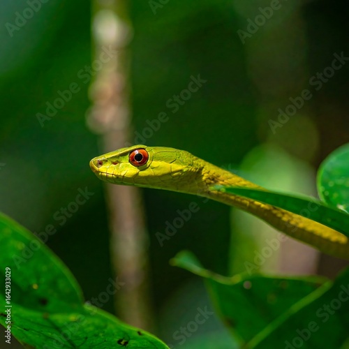 © Sumi, Obraz premium Close-up of a vibrant green snake with red eyes, partially concealed in lush green foliage