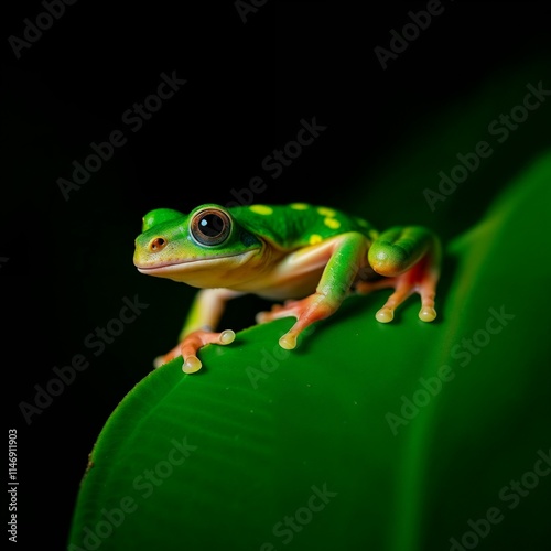 © Angelina, Obraz premium Close-up of a vibrant green tree frog resting on a leaf, nature wildlife photography concept