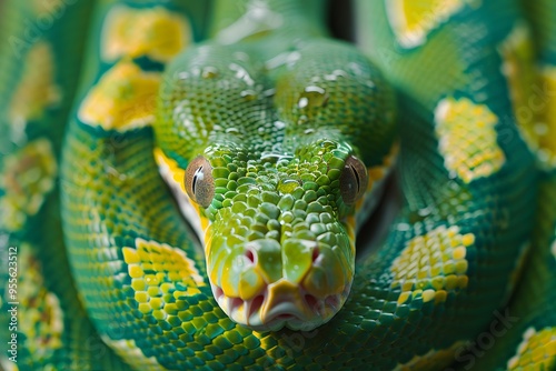 © Valentin, Fototapeta premium Close-Up of a Vibrant Green Tree Python with Distinctive Yellow Patterns