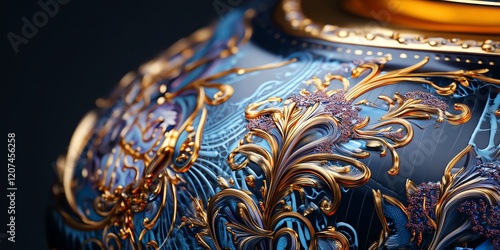 © Puchong, Fototapeta premium Close-up of a vibrant, holographic sculpture blending Baroque elements with sleek, futuristic circuitry, illuminated by soft LED lights, digital art, photorealistic rendering