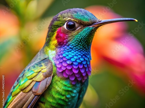 © Four888, Fototapeta premium Close-Up Of A Vibrant Hummingbird Design Featuring Intricate Wings, Iridescent Feathers, And Delicate Nectar-Feeding Beak.