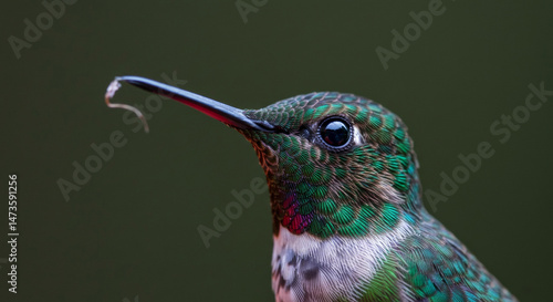 © Flatart, Obraz premium Close-up of a vibrant hummingbird with iridescent green and gray feathers, in a natural outdoor setting. The hummingbird is in profile view, its beak slightly angled, with a soft-focus background.