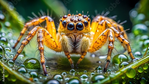 © trendf, Fototapeta premium Close-up of a vibrant jumping spider on a dewy leaf.