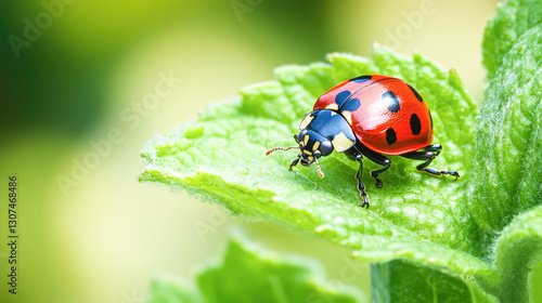 Obraz premium Close-up of a vibrant ladybug on a green leaf in natural light