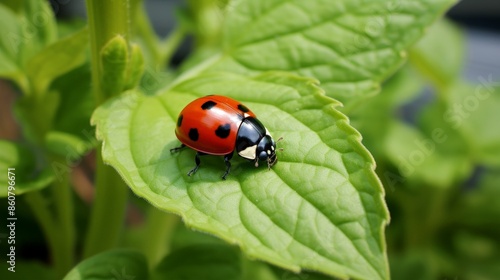 Fototapeta premium Close-up of a vibrant ladybug on a green leaf, showcasing nature's beauty and...