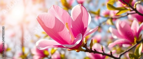 Obraz premium Close-up of a vibrant magnolia blossom in full bloom against a sunny spring...