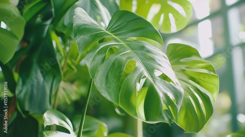 Obraz premium Close-up of a vibrant Monstera leaf amidst lush greenery.