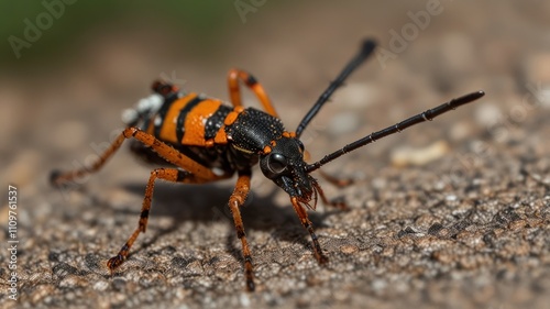 © Syarif, Fototapeta premium Close-up of a vibrant orange and black insect on a textured surface.