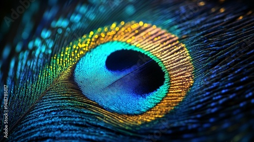 © Specelectra, Obraz premium Close-up of a vibrant peacock feather showcasing intricate details, iridescent colors, and textures.