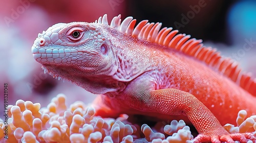 Fototapeta premium Close-up of a vibrant pink iguana resting on coral.