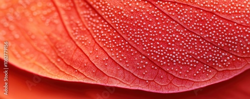 © Raweewit, Fototapeta premium Close-up of a Vibrant Red Leaf Capturing Intricate Textures and Dew Drops Against a Soft Background for Nature and Botanical Photography