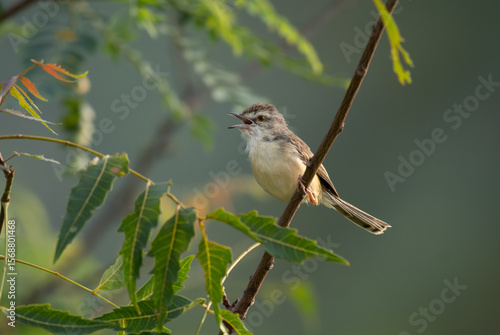 © siva, Naklejka premium Close up of a vibrant Rufous fronted prinia bird perched on a delicate tree branch against a lush green blurred background with open mouth.