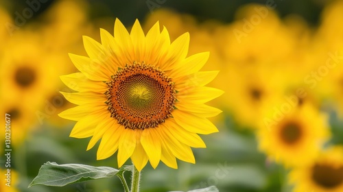© Suryani, Fototapeta premium Close up of a vibrant sunflower in a field of sunflowers. The bright yellow petals and brown center stand out against the blurred background.