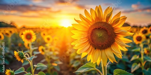 © Nasnunt, Obraz premium Close up of a vibrant sunflower in a field under the warm sunlight, beauty, natural, sunflower, vibrant, field, warm, sunlight