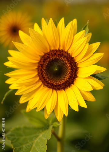 © mametelfatih, Fototapeta premium Close-up of a vibrant sunflower in full bloom, captured against a green field under soft natural lighting.