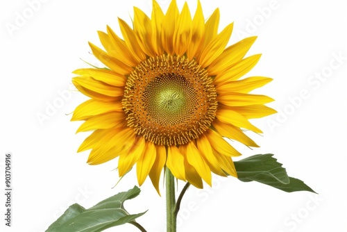 Fototapeta premium Close-up of a vibrant sunflower with green leaves isolated on white background