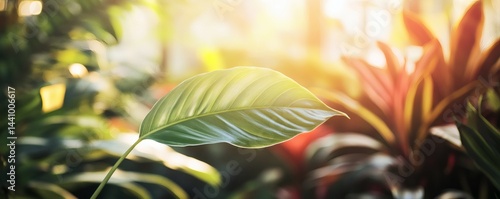 © kirania, Naklejka premium Close-up of a vibrant tropical leaf in sunlight.