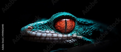 © Artificialstock, Fototapeta premium Close-up of a vibrant turquoise gecko with striking orange eye in dark setting.