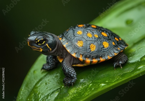 © ANUAR, Obraz premium Close-up of a vibrant turtle resting on a green leaf with rain droplets showcasing intricate patterns and textures of reptilian skin and habitat.