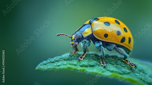 © ardanz, Fototapeta premium Close-up of a vibrant yellow and blue ladybug crawling on a green leaf.