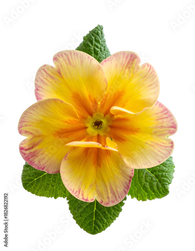 © Mandiri, Fototapeta premium Close-up of a vibrant yellow flower with pink edges, green leaves on black background