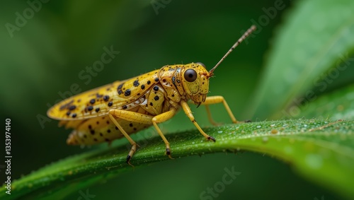 © benjamas, Fototapeta premium Close-Up of a Vibrant Yellow Grasshopper Resting on a Leaf in a Lush Green Environment
