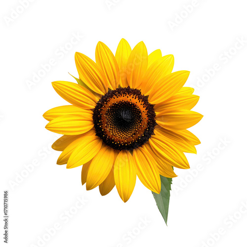 Fototapeta premium Close-up of a vibrant yellow sunflower, detailed petals, dark brown center, and single green leaf