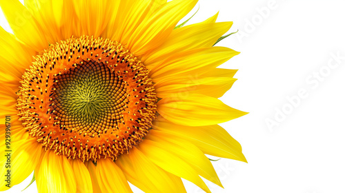 Fototapeta premium Close-up of a vibrant yellow sunflower with detailed petals and seeds, against a clean white background.