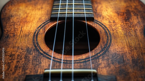 © logyartstudios, Obraz premium Close-up of a vintage ukulele's sound hole and strings.