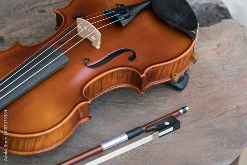 © KissShot, Fototapeta premium Close up of a violin on wooden surface