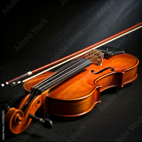 © Shavy, Fototapeta premium close up of a violin with a wooden bow on a black background
