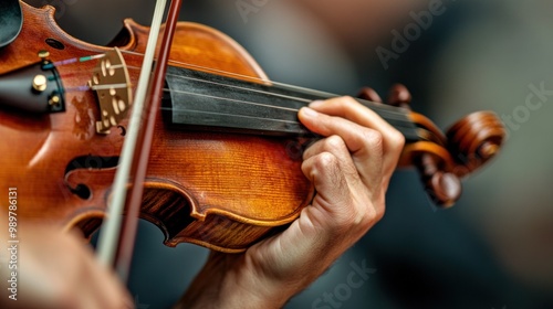© BerkahStock, Fototapeta premium Close-up of a Violinist's Hand Playing a Violin