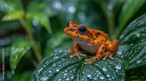 Obraz premium Close-up of a vivid orange frog resting on a leaf, sunlight catching tiny droplets on its skin, highly detailed wildlife stock image composition