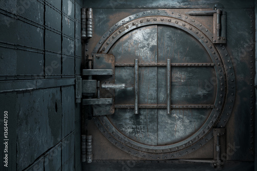 © PhotoArtHub, Fototapeta premium Close-up of a weathered, circular metal door with rivets and hinges, set within a dark metallic wall, suggesting age, security, and mystery