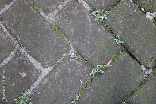 © PanicStudio, Obraz premium Close-up of a weathered concrete pathway with moss and cracks.